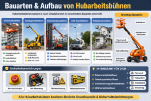 Trotz der verschiedenen Bauarten besitzen alle Hubarbeitsbühnen ähnliche Grundbauteile und Funktionen.